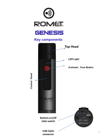 Key components Top Head + - LED Light Activator Tone Button Control Panel Bottom on/off slide switch USB Cable 2 connector